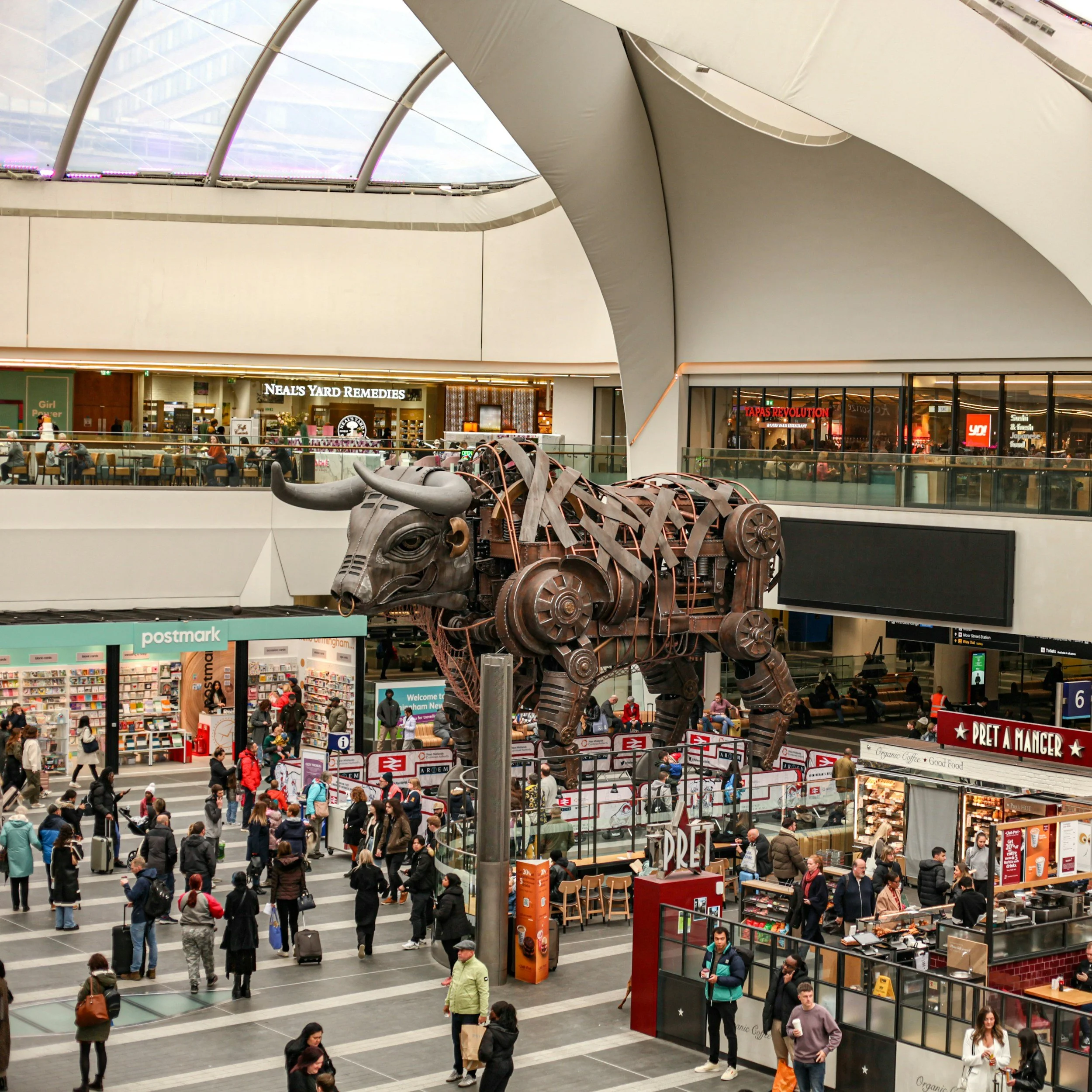 Image: Unsplash, Birmingham New Street Station featuring Commonwealth Games Birmingham Bull.